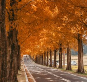 四季ごとに姿を変える一本道は、まるで海外の景色のよう。手軽に非日常を感じられるスポット。