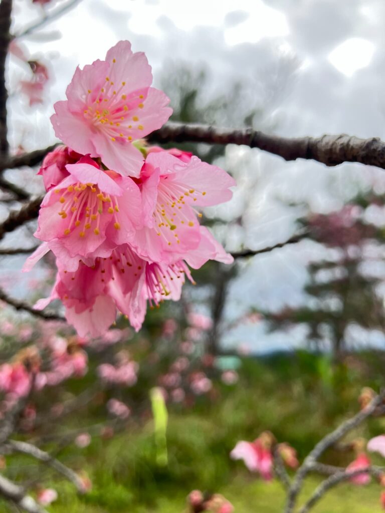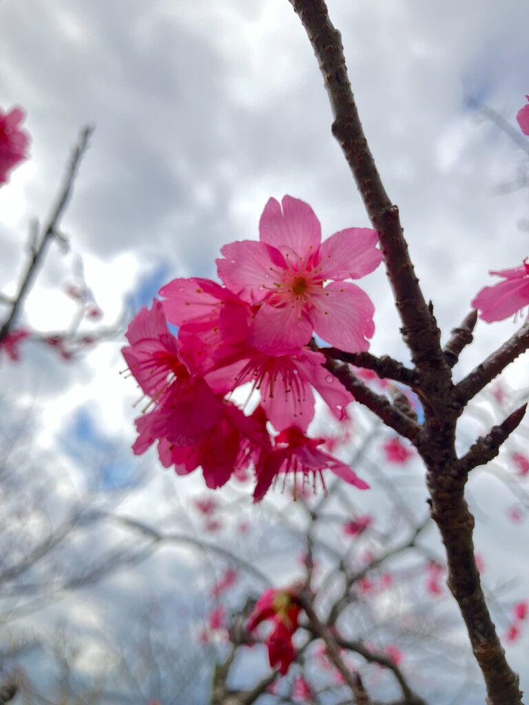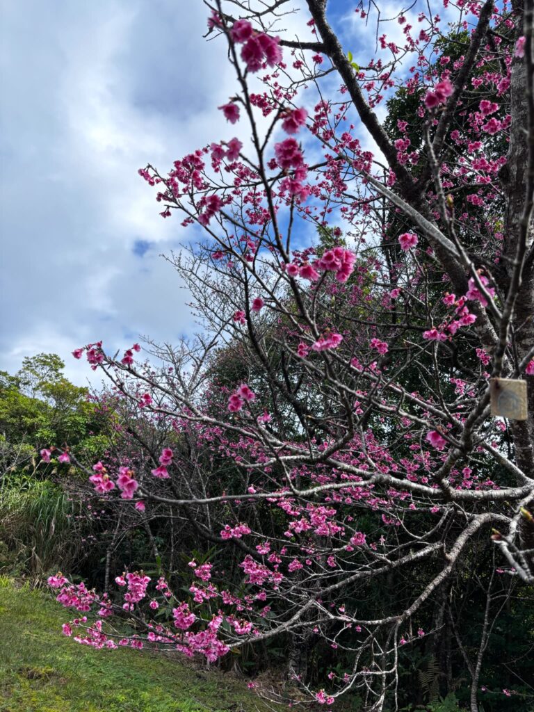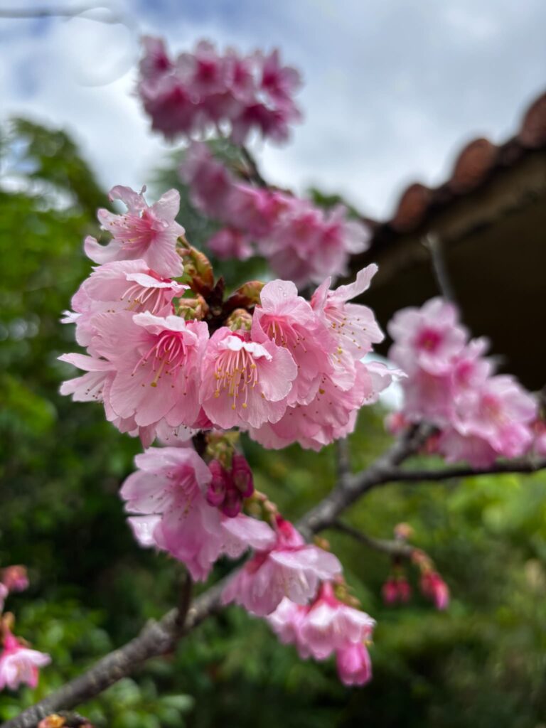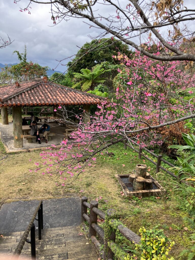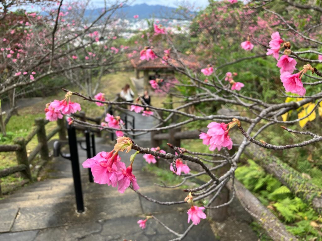 園内に咲くのは、沖縄で親しまれているカンヒザクラ(寒緋桜)。濃いピンク色の花が特徴で、本土のソメイヨシノよりも早い1〜2月に開花します。花はうつむくように下向きに咲き、花を見上げたときの青空とのコントラストがひときわ美しいです。
