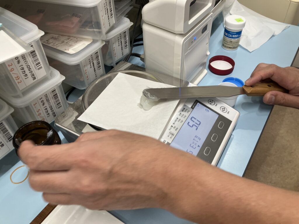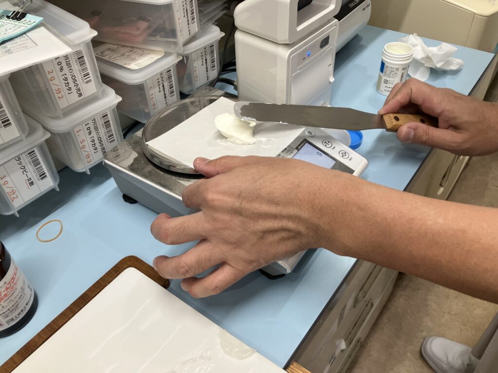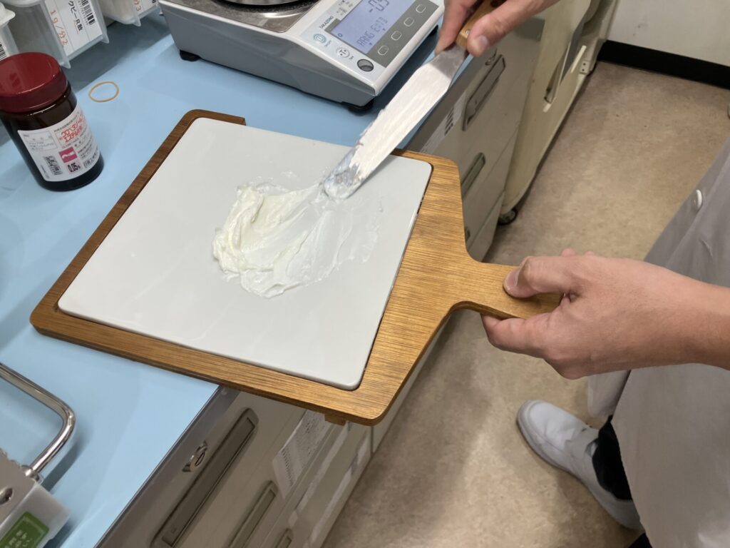 軟膏の調合は、実はほとんどが手作業です。薬剤師がヘラと軟膏板を使い、均一でムラが無いように丹念に混合していきます。