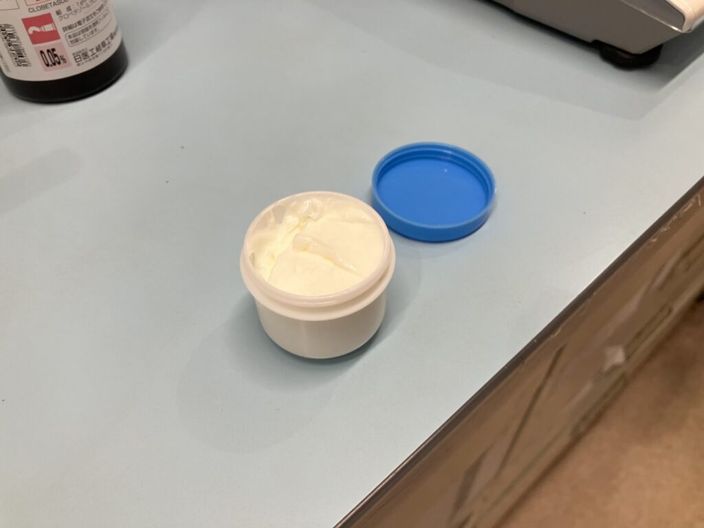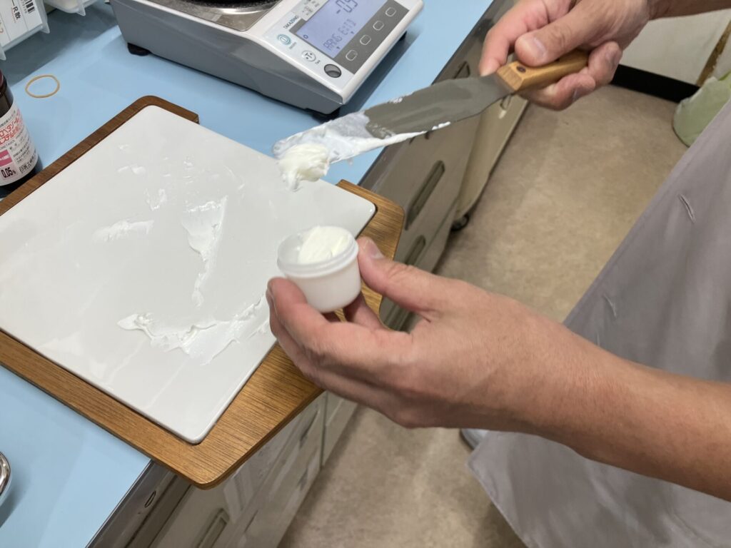 均一に混合された軟膏を、消毒済みの軟膏容器に移します。容器からはみ出さないようにするにはテクニックが必要です。